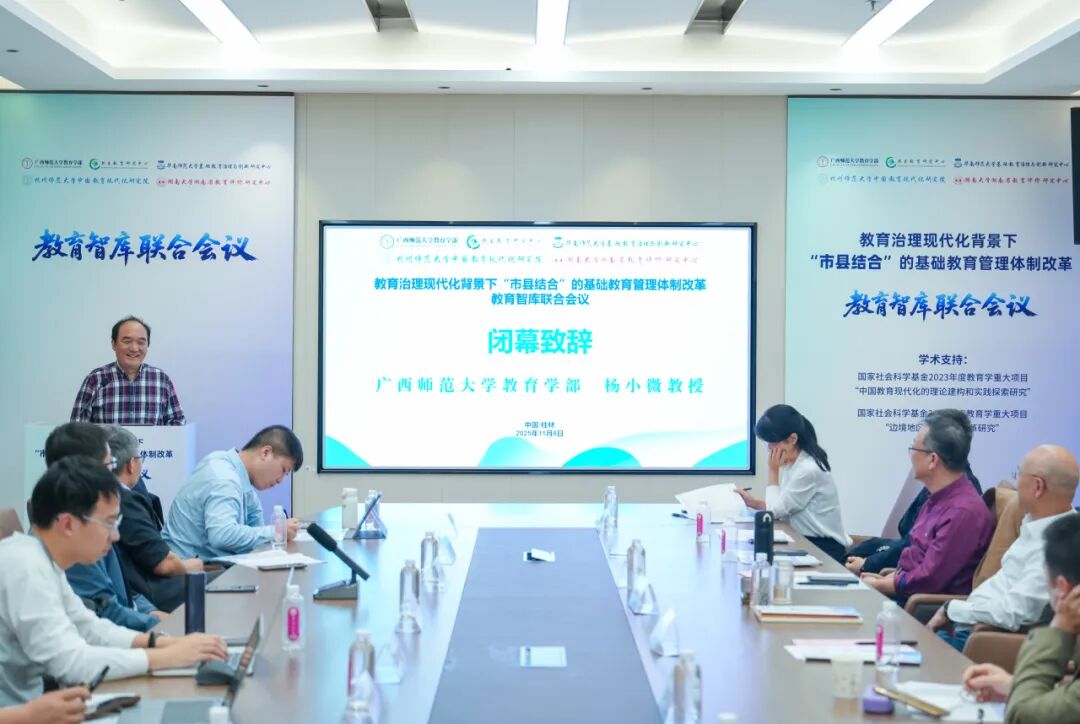2025年11月8日,“教育治理现代化背景下‘市县结合’的基础教育管理体制改革”专题研讨会暨教育智库联合会议在广西桂林顺利召开。本次会议由广西师范大学教育学部、广西高校人文社会科学重点研究基地共生教育研究中心联合华南师范大学基础教育治理与创新研究中心、杭州师范大学中国教育现代化研究院、湖南大学湖南省教育评价研究中心共同主办。会议设置15场主旨报告和2场专题交流研讨,来自全国各地的60余名专家学者围绕基础教育管理体制改革、县域教育治理创新以及县中振兴等核心议题进行深入探讨。